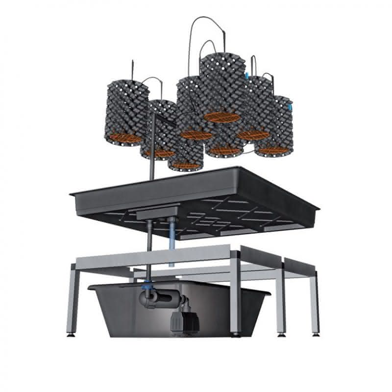 | 0.8 | 80 × 80 cm | 8 × Superoot AIR-POT 3 L, growTABLE square 0.8, growRACK modular 0.8-25 | 2 Wasserspinnen inkl. 8 Dropper | growPUMP nutrient HX-8808 | growTANK nutrient 40 L (HYDRO) |